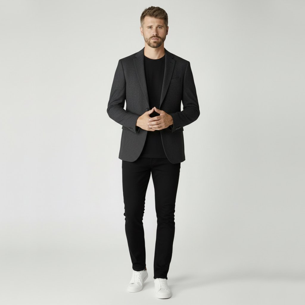 Pre Rockstar Business look ho skombinujte s čiernymi úzkymi džínsami a sivým salkom s jemným vzorom. Ak chcete pôsobiť minimalisticky, doplňte ho antracitovými nohavicami a kvalitnými hodinkami.