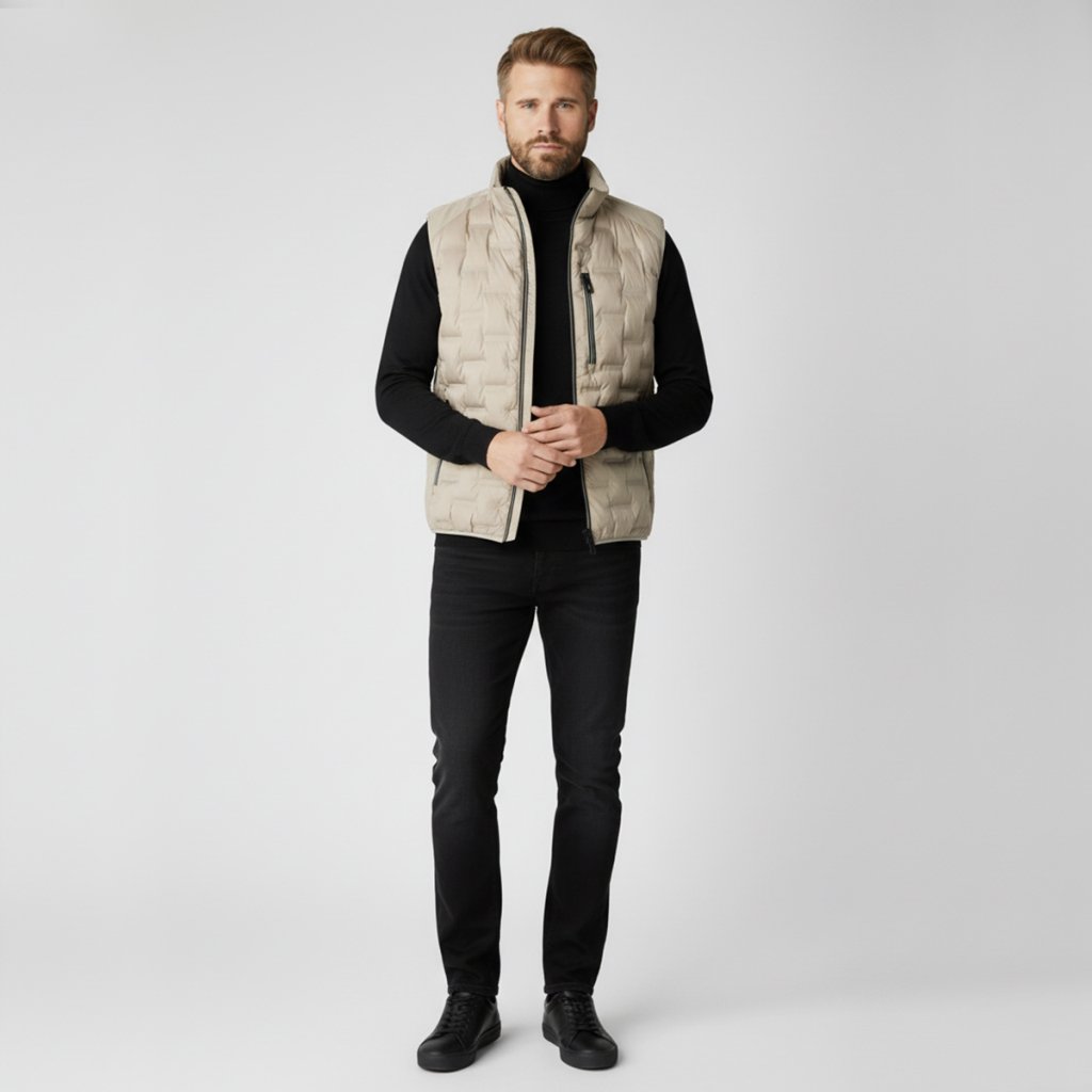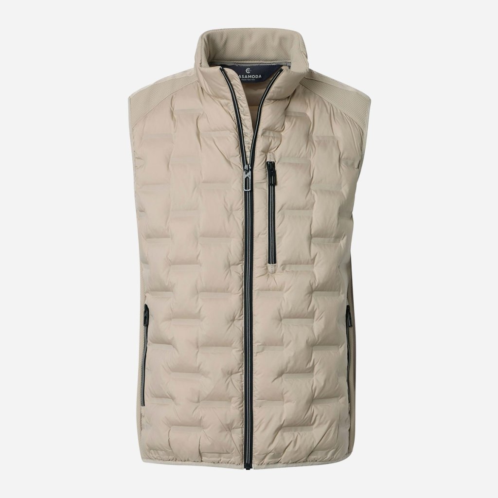 Béžová prešívaná vesta od nemeckej značky CASAMODA je odpoveďou na potrebu všestranného kúsku, ktorý pôsobí sviežo a zároveň profesionálne. Pieskový odtieň je v pánskej móde symbolom vkusu a v kombinácii s moderným prešívaným dizajnom vytvára harmonický celok. Táto vesta je navrhnutá tak, aby vám poskytla tepelný komfort bez pocitu ťažoby, vďaka čomu je ideálnou voľbou pre prechodné obdobie.
