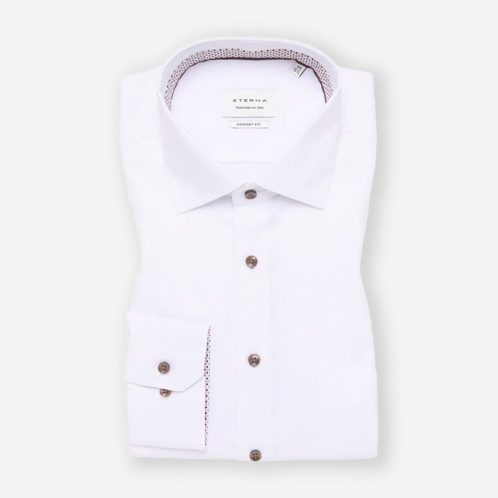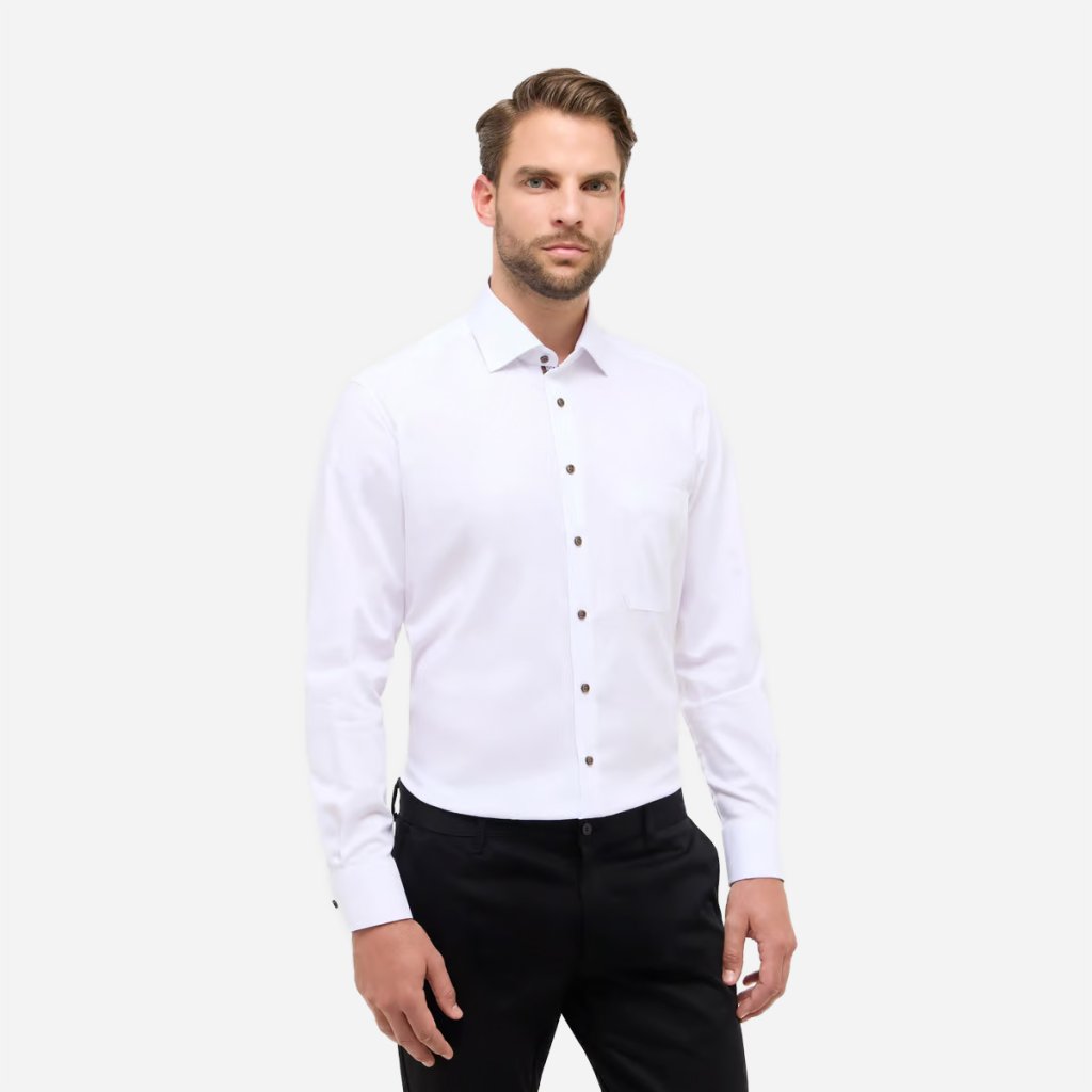 Táto biela pánska košeľa ETERNA je určená pre mužov, ktorí chcú komfort, upravený vzhľad a minimálnu starostlivosť. Špeciálna natté väzba vytvára jemnú štruktúru látky, ktorá je dobre viditeľná, no nepôsobí rušivo.Látka má väčšie póry, vďaka čomu je košeľa veľmi priedušná a príjemná aj pri celodennom nosení. Použitá bavlna je non-iron, takže po vypraní stačí košeľu usušiť a môžete ju rovno nosiť.