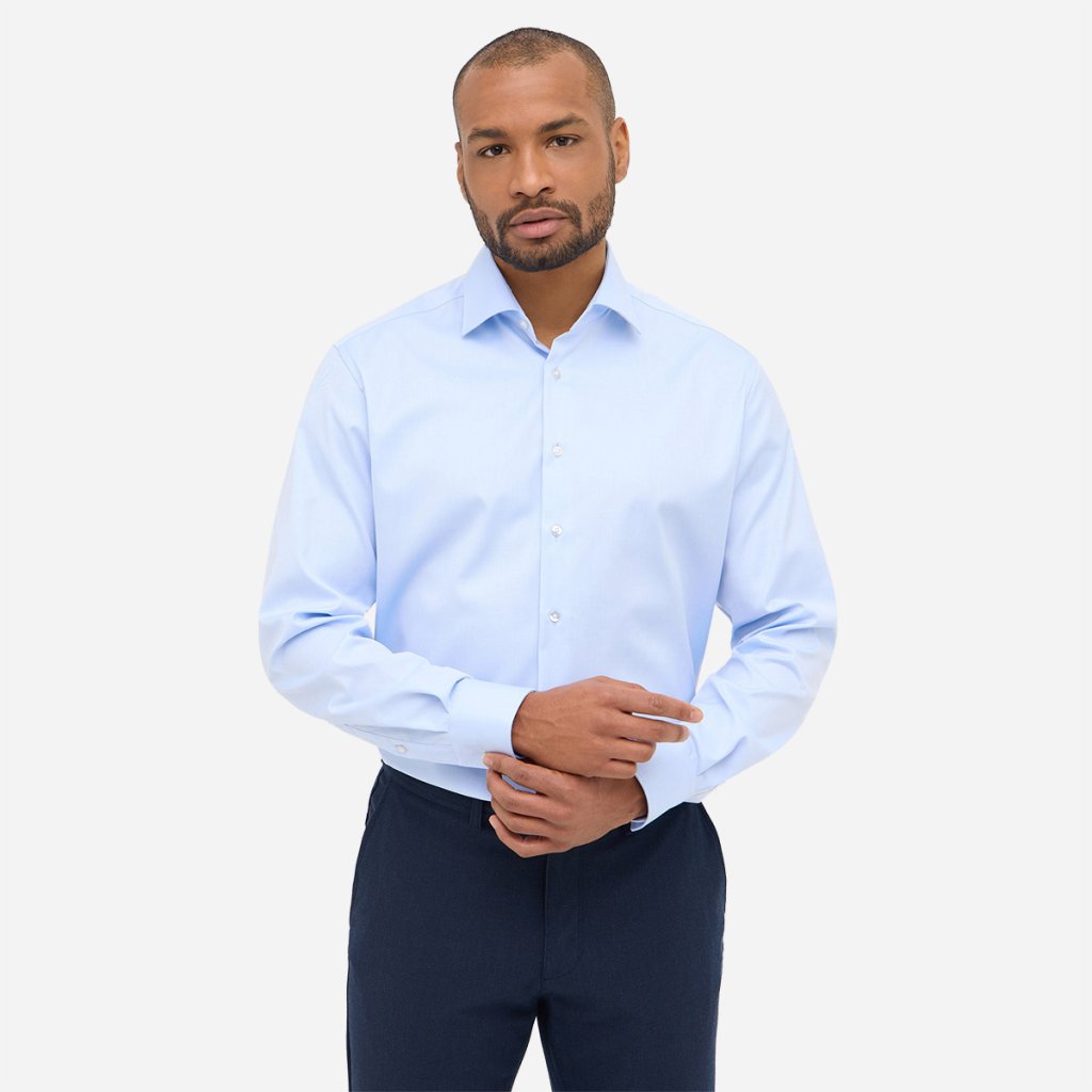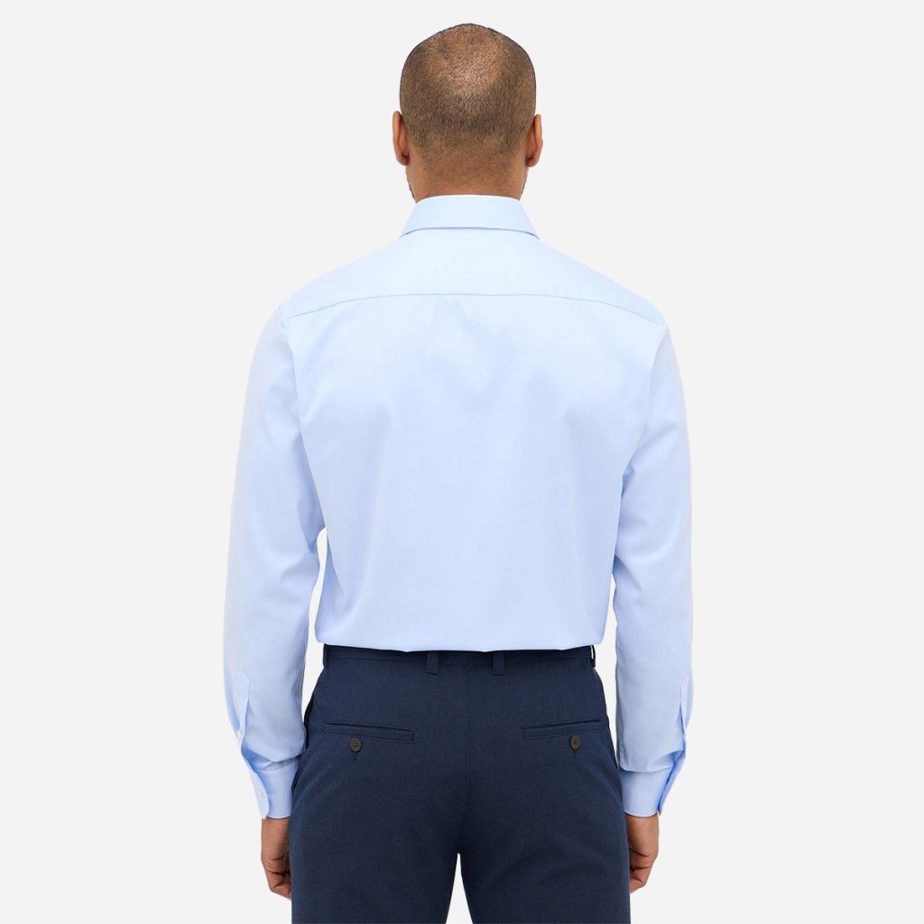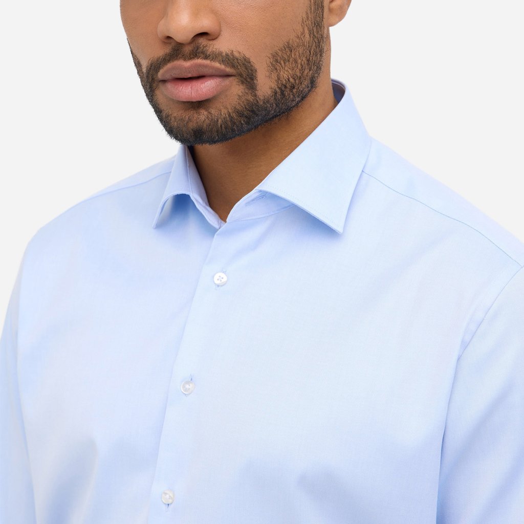 Klasický Kent golier podčiarkuje elegantný charakter košele – ideálny na formálne stretnutia, kanceláriu aj spoločenské udalosti. Svetlomodrý odtieň a perfektná nepriehľadnosť robia z tejto košele nevyhnutný základ každého business šatníka.