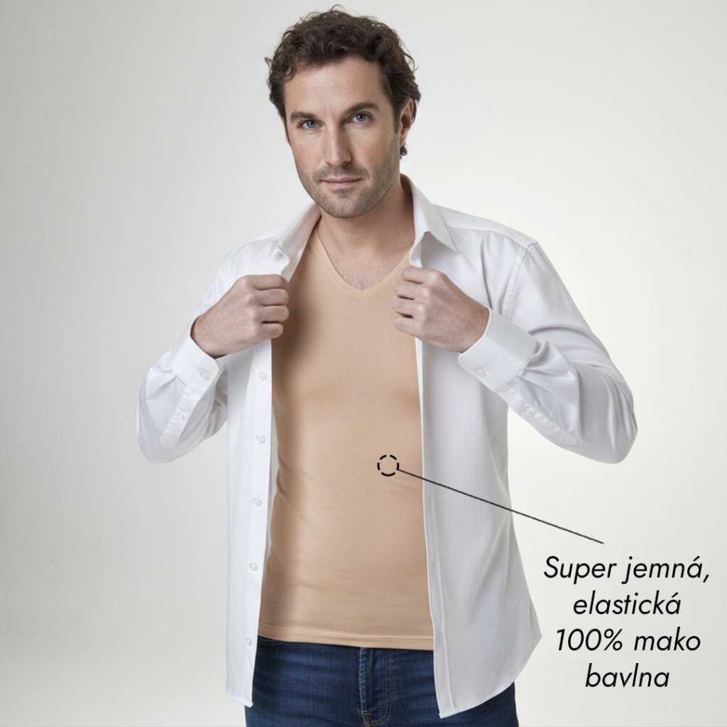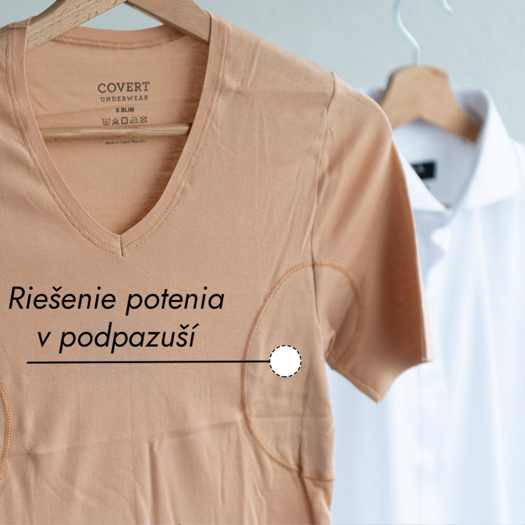Pánske "potítkové" tričko má zosilnené podpazušie, ktoré vás dokonale ochráni pred mokrými škvrnami v podpazuší. Neviditeľné pánske tričko je určené pre tých, ktorí si zvykli nosiť pod košele namiesto tielka práve tričko. Keďže biele tričko pod bielou či svetlou košeľou presvitá najmä v mieste, kde sú rukávy, nahradili sme bielu farbu telovou (béžovou) farbou.
