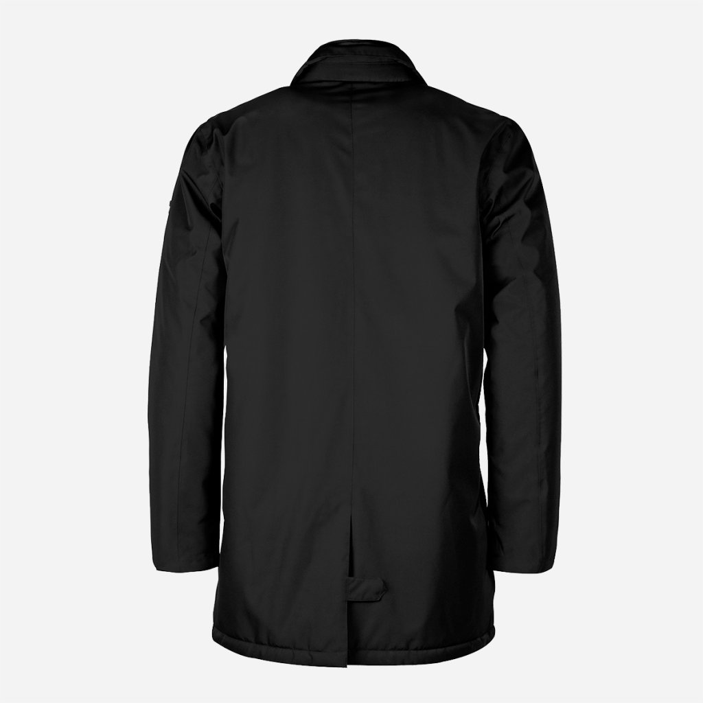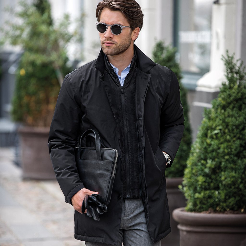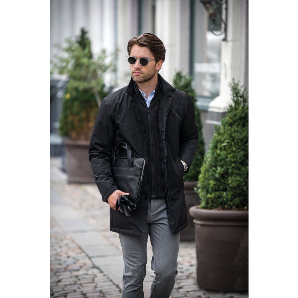 Moderný pánsky business kabát odolná voči vetru a ľahkému dažďu. Recyklovaný materiál a izolácia Sorona® Aura riešia chlad bez zbytočnej objemnosti.