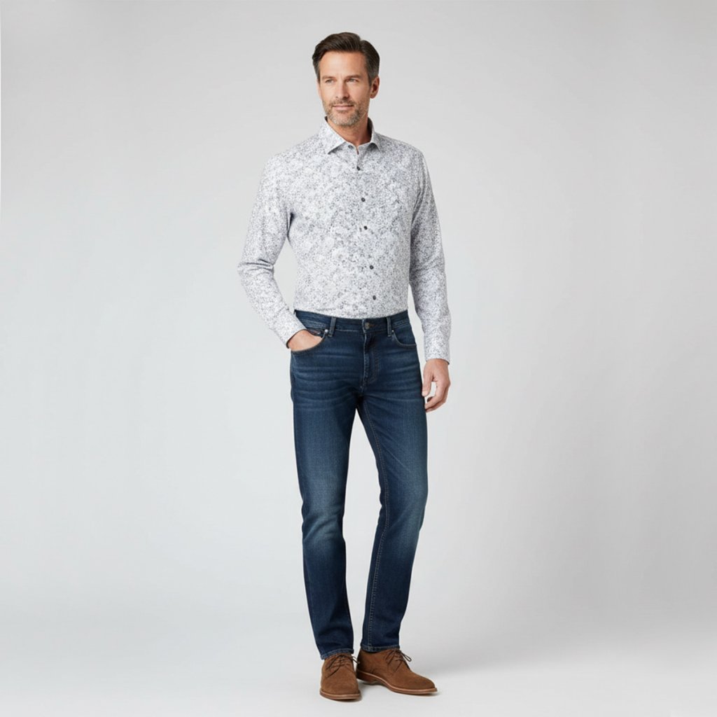 Modern Fit strih je mierne zúžený, vytvára štíhlejší vzhľad a dobre sedí pod sakom. Košeľa nepôsobí voľne ani objemne, čo oceníte pri pracovných stretnutiach aj bežnom nosení do kancelárie.