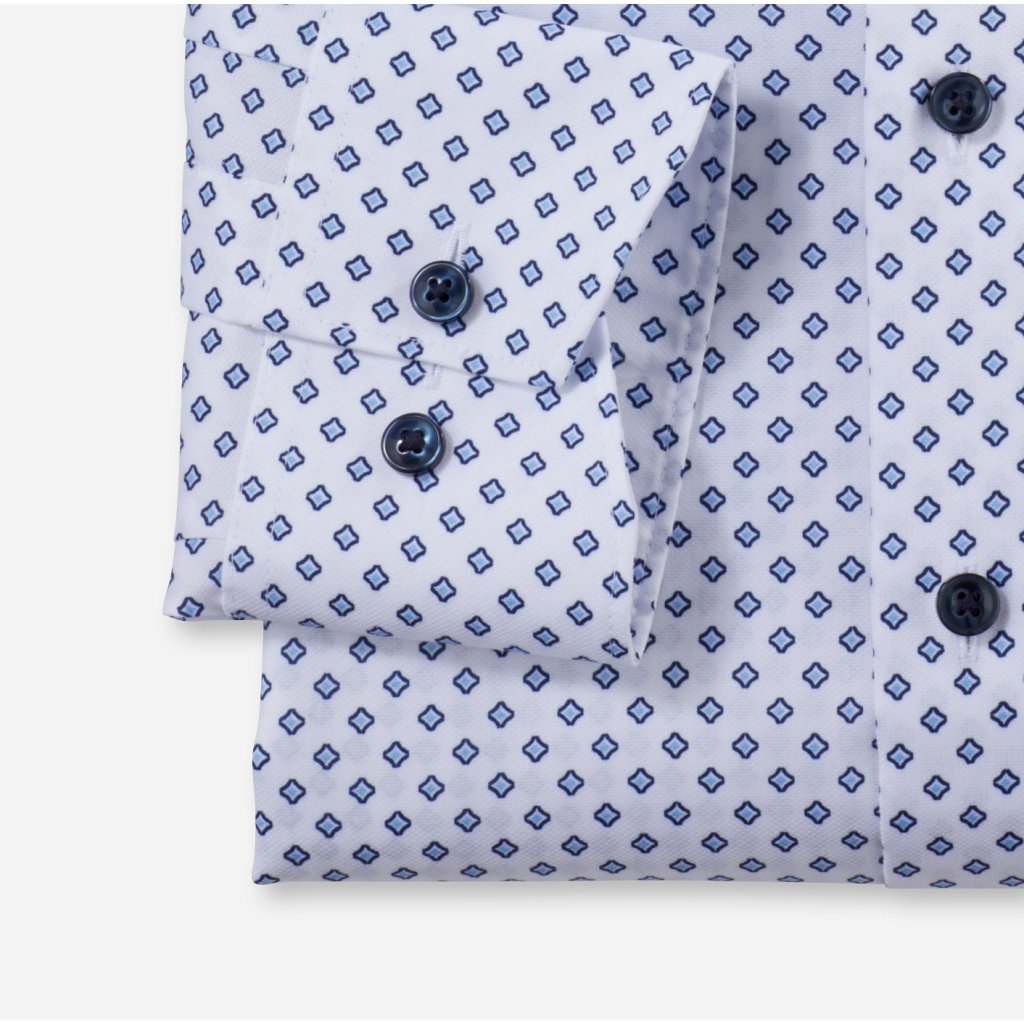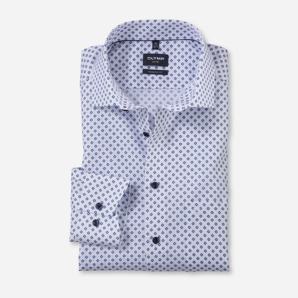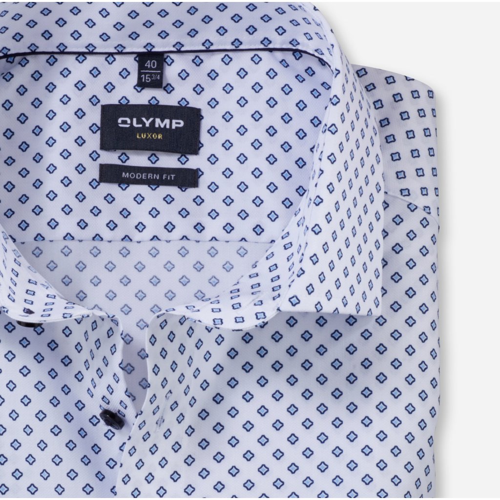 Elegantná pánska košeľa OLYMP Luxor v strihu Modern fit zo 100 % bavlneného popelínu s celoplošným svetlomodrým vzorom. Edícia OLYMP Luxor je určená pre najnáročnejších zákazníkov, ktorí ocenia kvalitnú bavlnenú látku, precízne vypracovanie a elegantný štýl. Vysokopriedušný materiál a nežehlivá úprava zaručujú maximálny komfort a uľahčia vám každodennú starostlivosť.