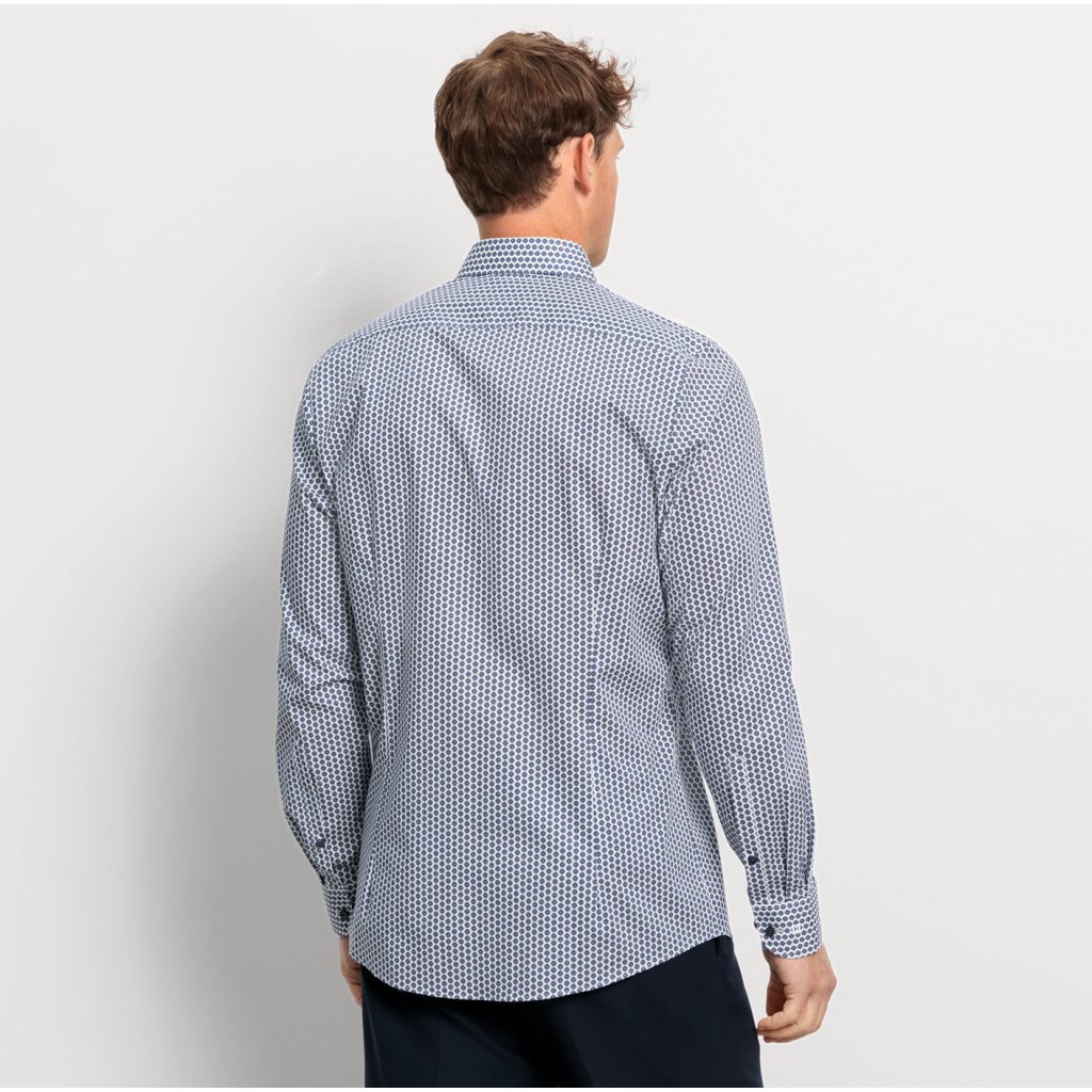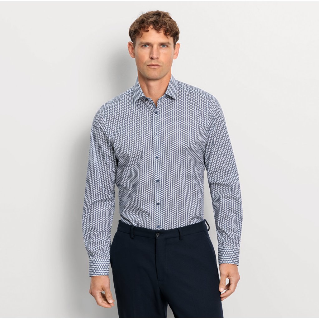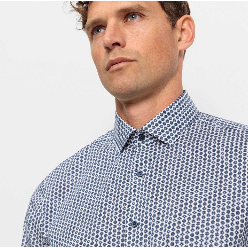 Moderná pánska košeľa so vzorom vhodná do kancelárie aj na voľný čas. Vysokokvalitná rotačná sieťotlač na klasickej bielej farbe - prichádza štýlová biznis košeľa pre športovo založeného štíhleho muža. Náš mužný strih na telo sa stretáva s pohodlnou tkaninou Comfort Stretch, spracovanou ako jemný bavlnený popelín s hladkým omakom. S kontrastnými gombíkmi a moderným golierom Kent.
