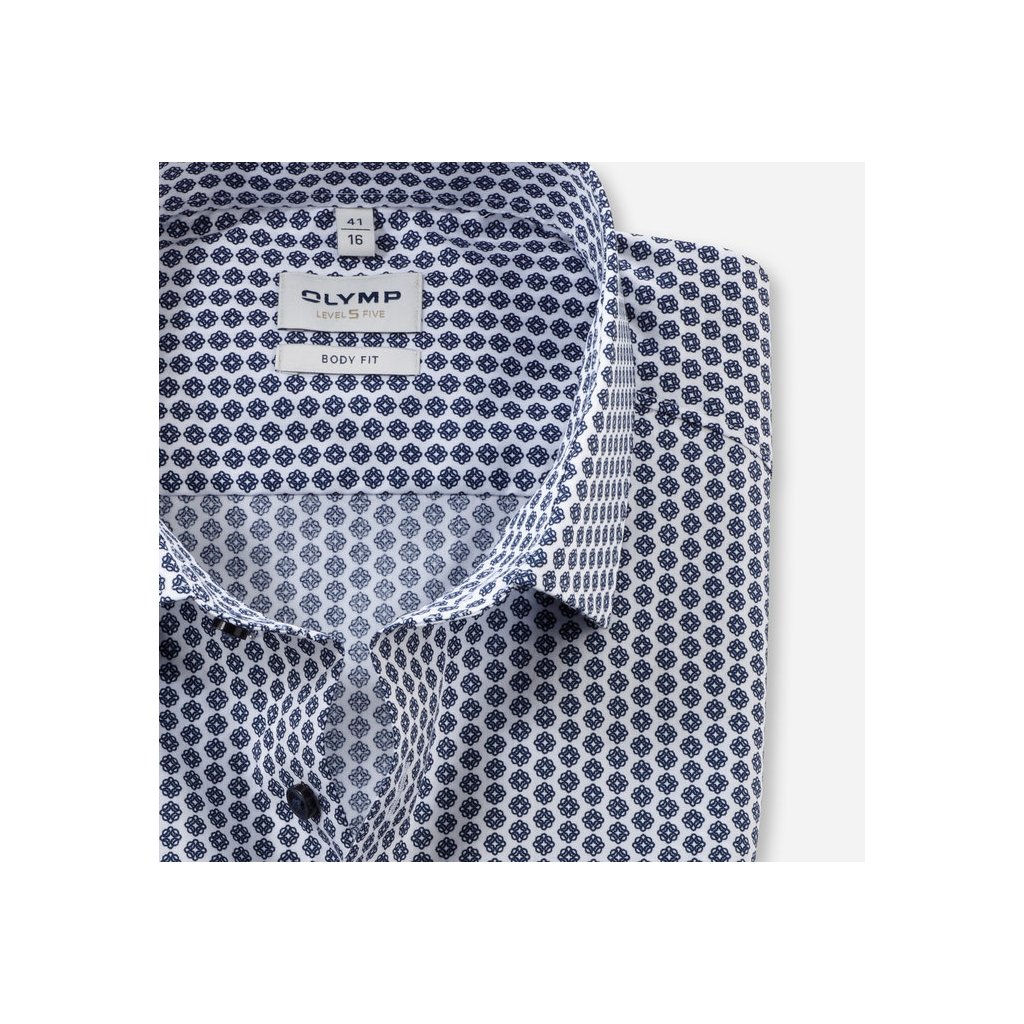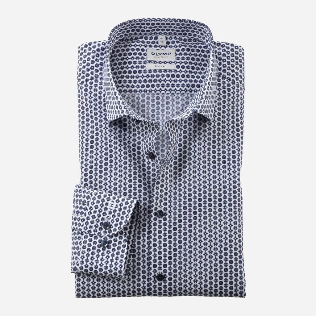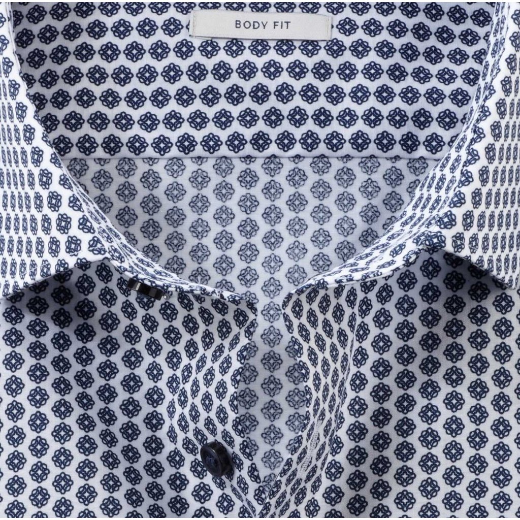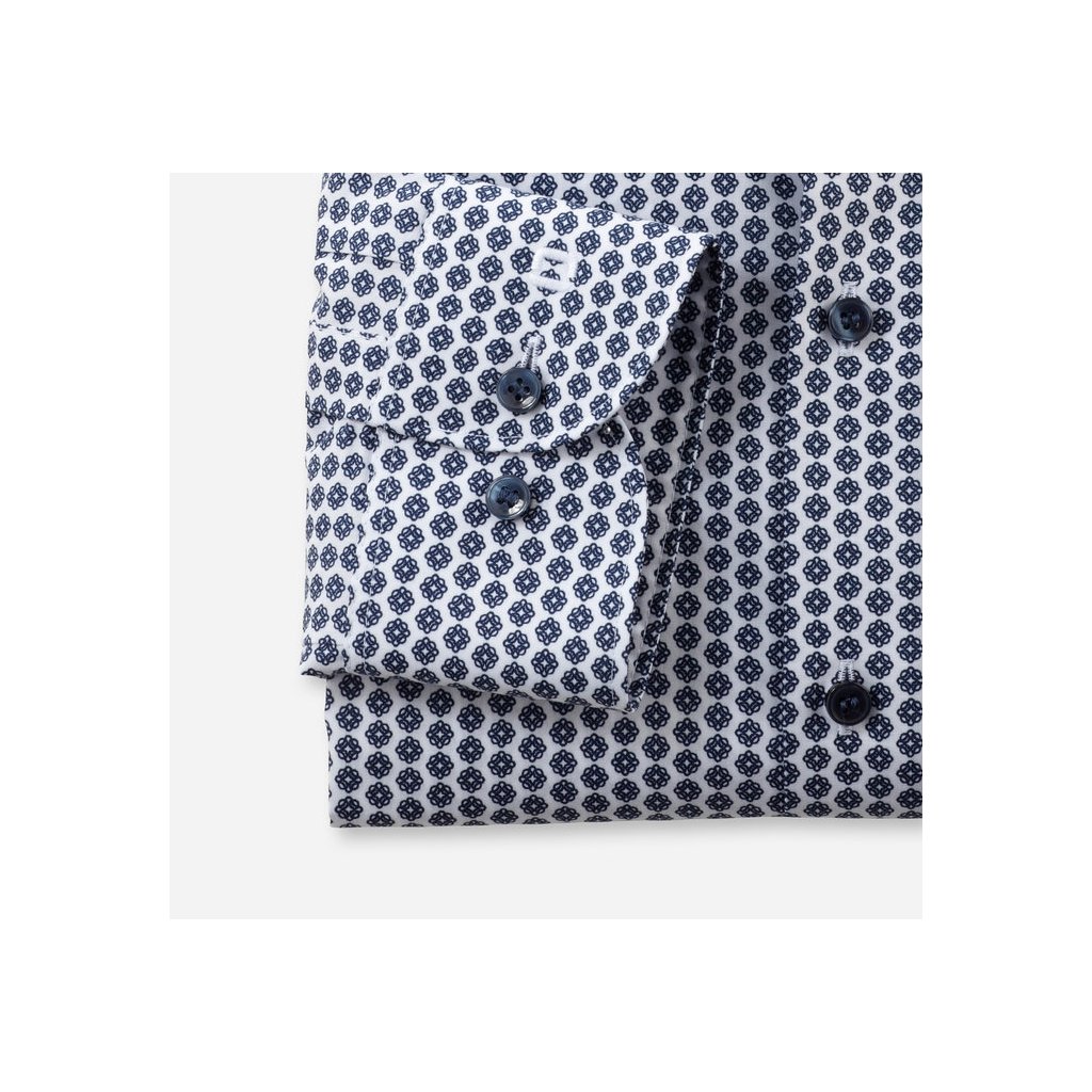 Moderná pánska košeľa so vzorom vhodná do kancelárie aj na voľný čas. Vysokokvalitná rotačná sieťotlač na klasickej bielej farbe - prichádza štýlová biznis košeľa pre športovo založeného štíhleho muža. Náš mužný strih na telo sa stretáva s pohodlnou tkaninou Comfort Stretch, spracovanou ako jemný bavlnený popelín s hladkým omakom. S kontrastnými gombíkmi a moderným golierom Kent.