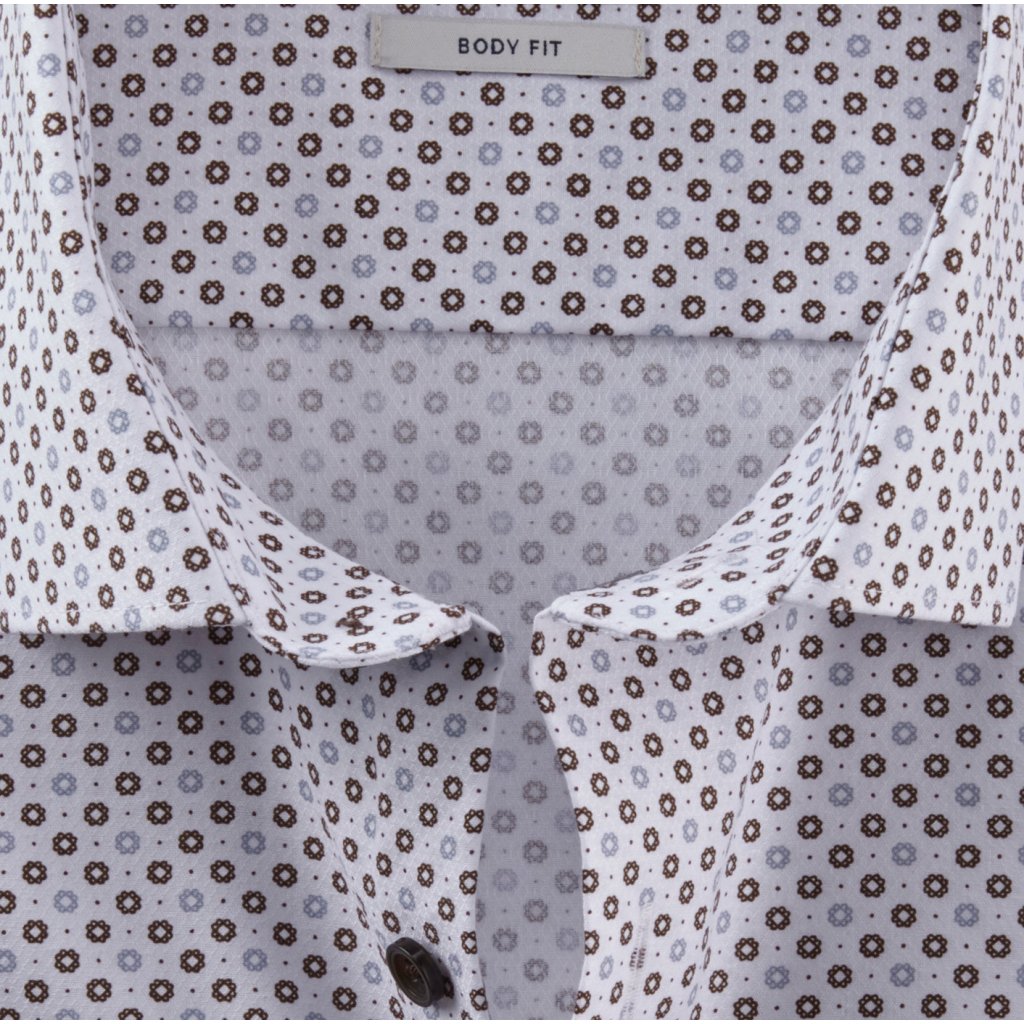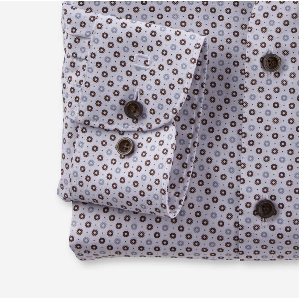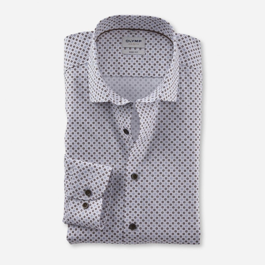 Moderná pánska košeľa OLYMP z rady Level Five v strihu body fit s celoplošným vzorom. Košeľa má biely podklad a hnedý a sivý vzor z ornamentov, ktoré dotvárajú celkový dojem. Priedušná tkanina obsahujúca strečové vlákna elastolefinu poskytuje košeli vynikajúcu pružnosť, aby bola extrémne poddajná pri akomkoľvek pohybe.