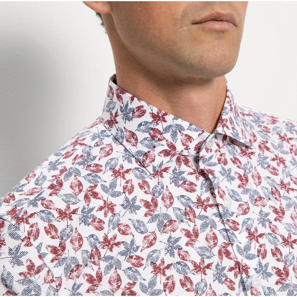Moderná pánska košeľa so vzorom vhodná do kancelárie aj na voľný čas. Štýlový motív listov s vysokokvalitnou rotačnou sieťotlačou a inovatívne high-tech priadze robia z tejto košele OLYMP Level Five vrchol jesennej ponuky. Strih je prispôsobený na telo (Body fit), má extra elastické, priedušné a teplotu regulujúce vlastnosti. Štýlová košeľa 24/Seven s klasickým golierom Kent.