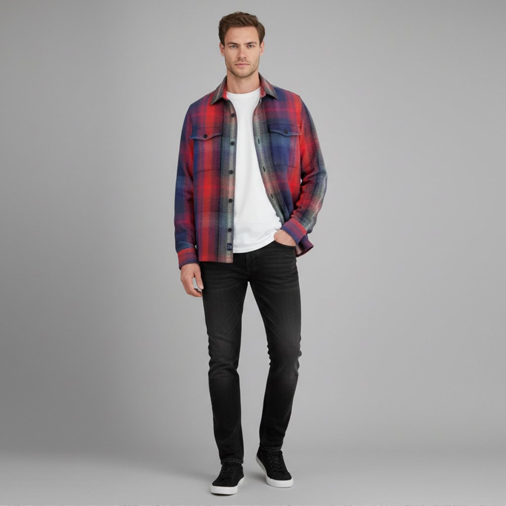 Tento model vyniká svojou hlbokou červenou farbou, ktorá pôsobí veľmi mužne a ľahko sa kombinuje. Košeľa disponuje dvomi funkčnými náprsnými vreckami s chlopňami, ktoré jej dodávajú moderný "utility" charakter. Pevný materiál s jemnou štruktúrou výborne drží tvar aj po celodennom nosení.