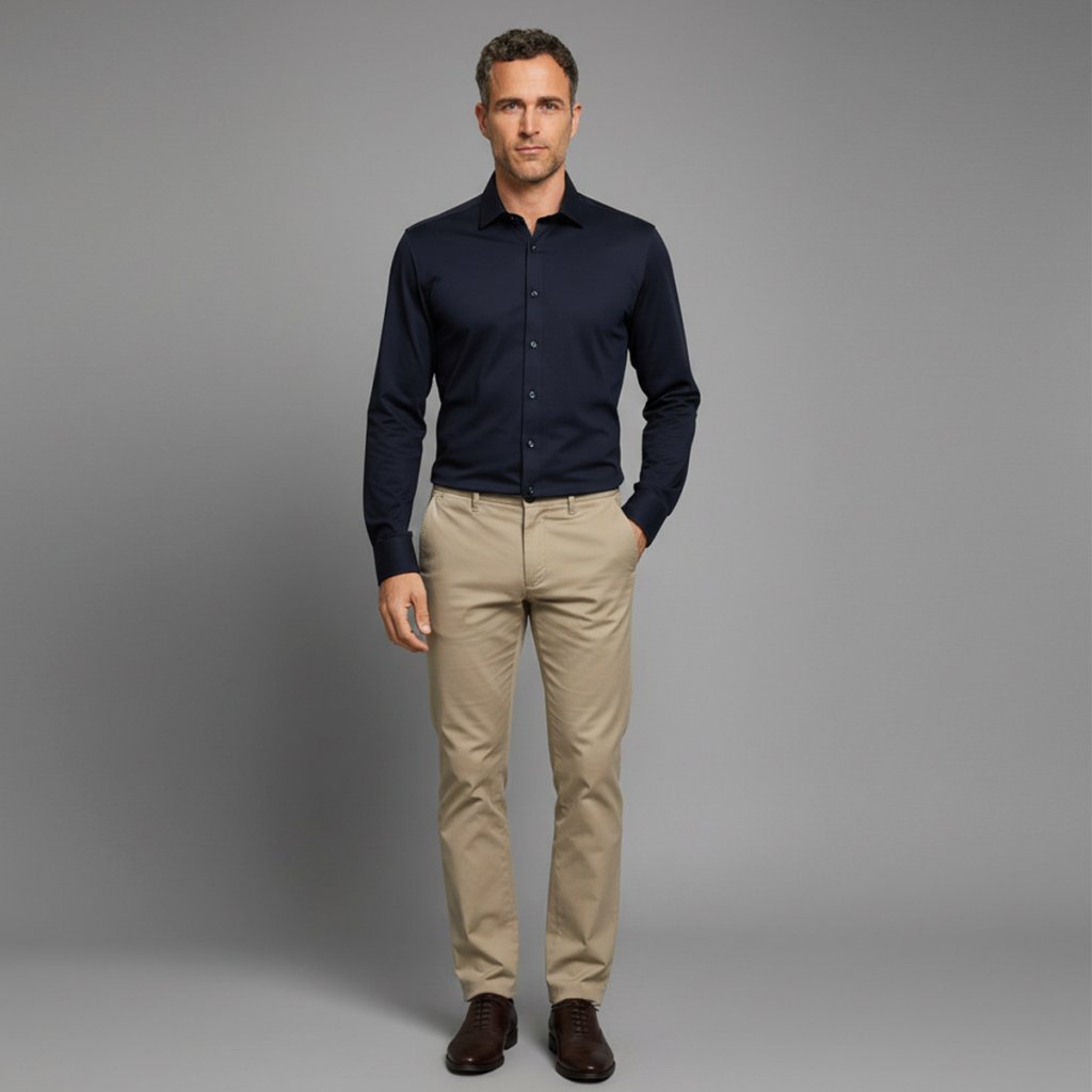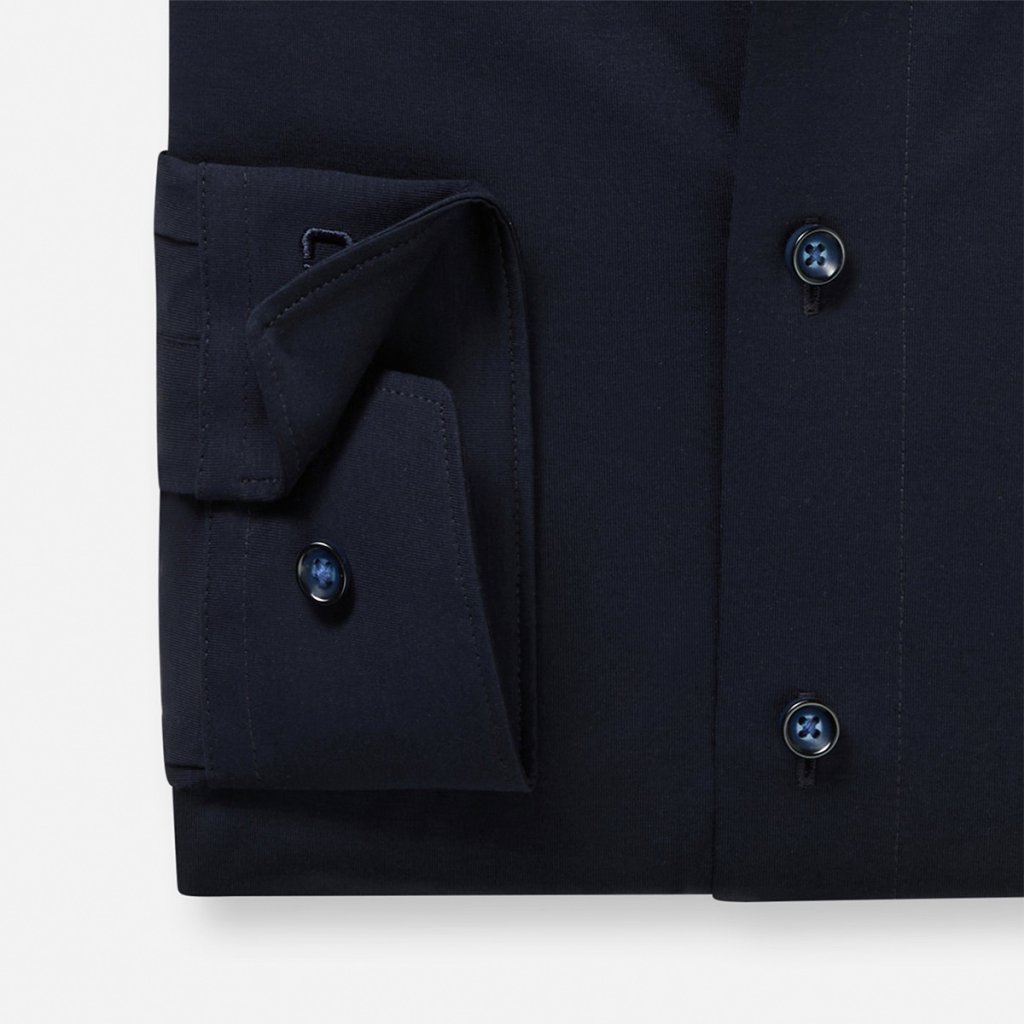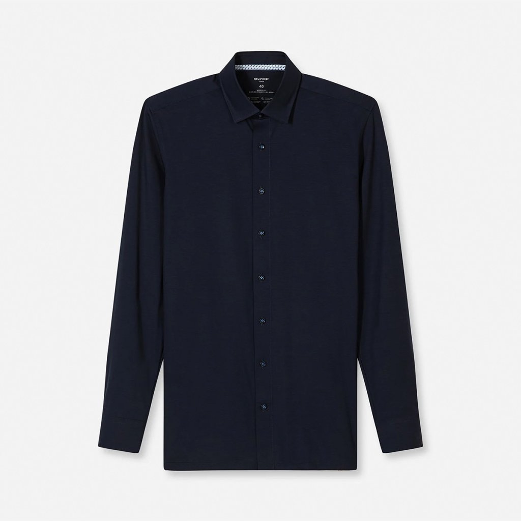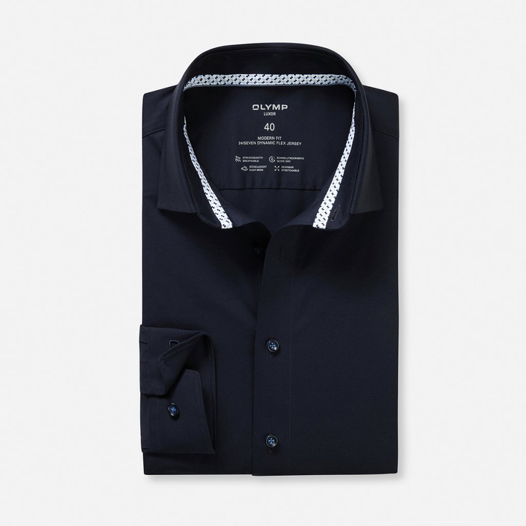 OLYMP Luxor 24/Seven v odtieni Marine je odpoveďou na nároky modernej doby. Už nemusíte voliť medzi upätou košeľou a voľnočasovým tričkom. Vďaka unikátnemu materiálu Dynamic Flex získavate kúsok, ktorý pruží do všetkých strán, dokonale dýcha a pohlcuje pachy, čo oceníte počas náročného cestovania aj v stresových momentoch.