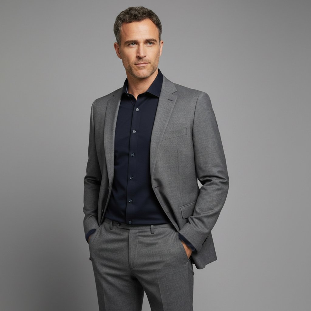 Tmavomodrá (Marine) je základným kameňom šatníka. Skvele funguje v kombinácii so svetlosivým oblekom pre moderný kontrast.