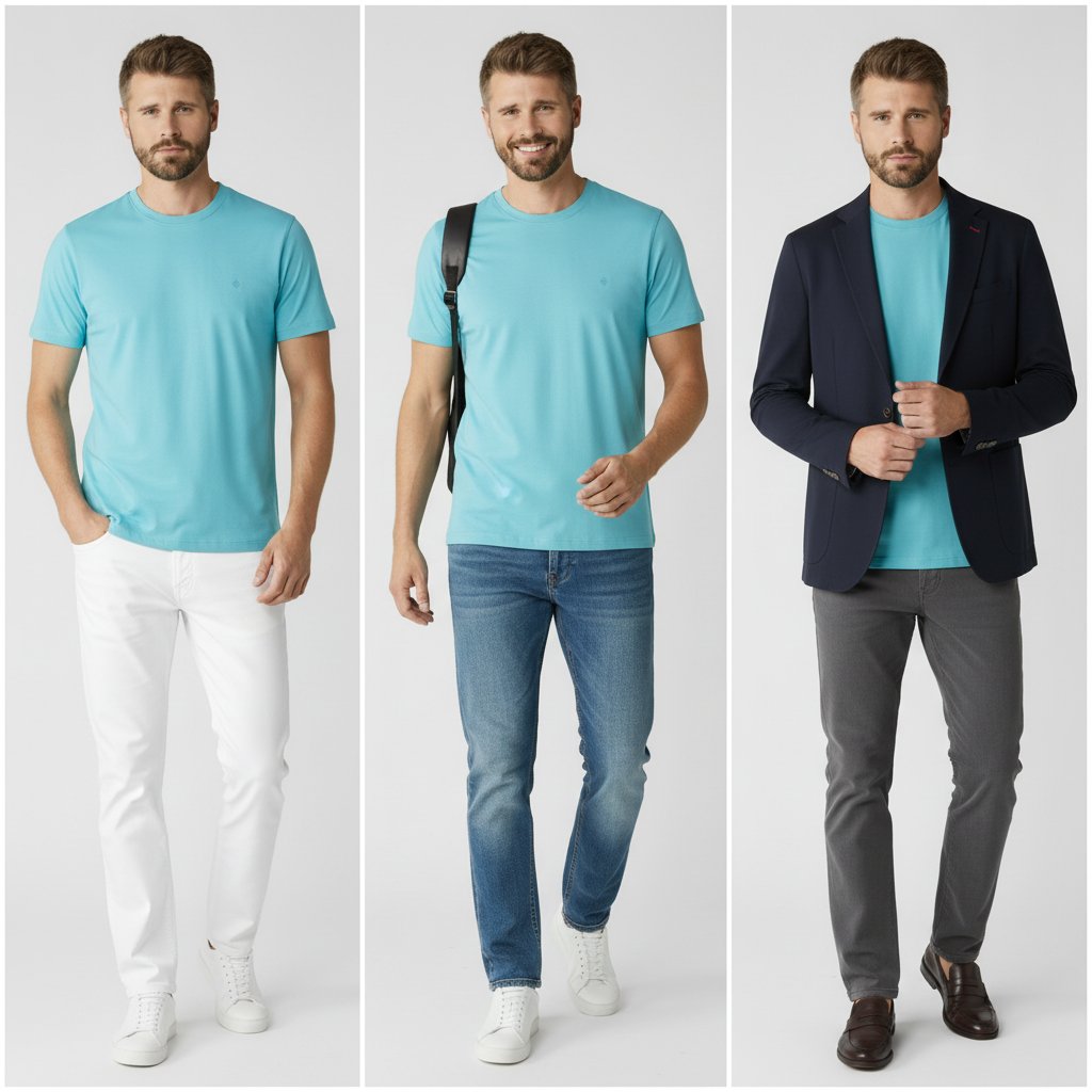 Tyrkysová farba vytvára dokonalý kontrast s bielymi alebo svetlosivými nohavicami.