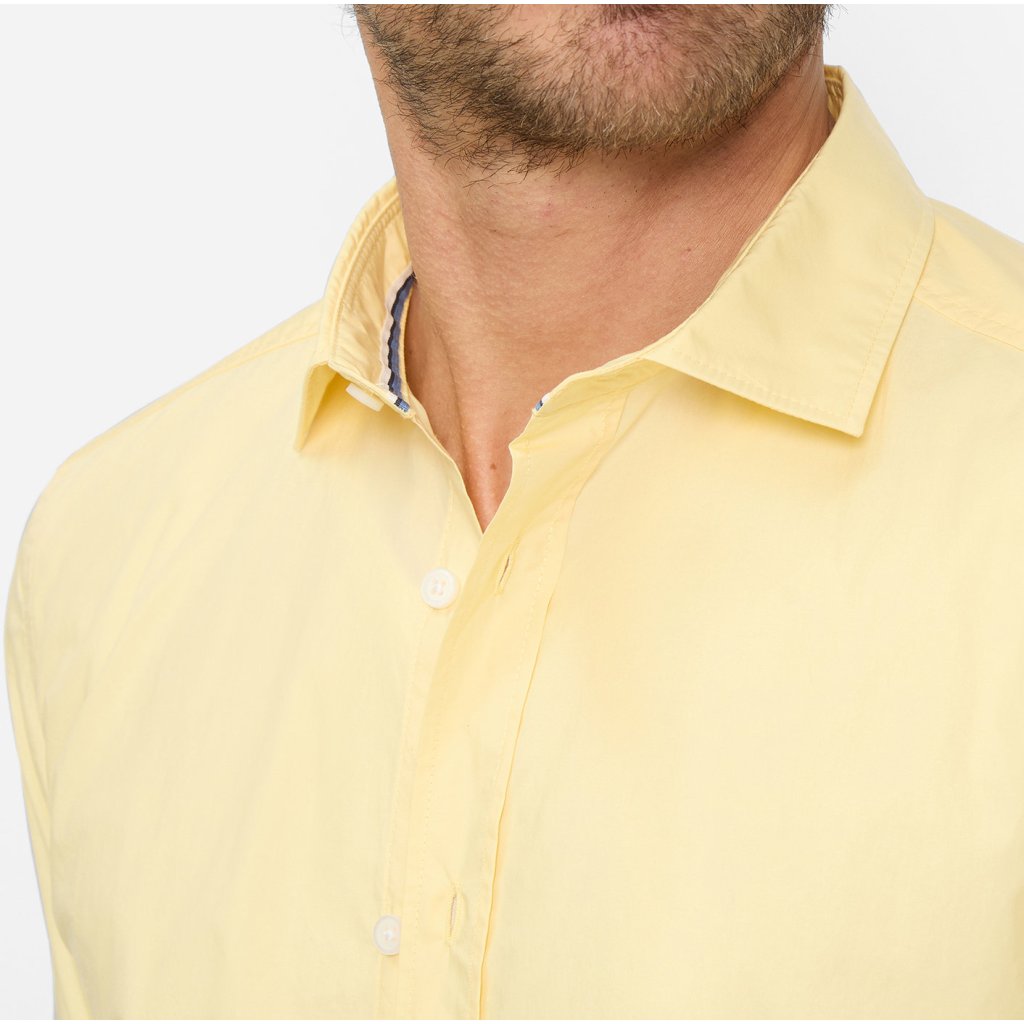 A tá farba? Žltá. Nie krikľavá. Svieža. Ako ranné slnko v prímorskom meste, ktoré ešte nestratilo trpezlivosť. Vďaka klasickému golieru Kent košeľa dobre drží tvar a zároveň zostáva voľná, keď si to situácia pýta. Bez náprsného vrecka – lebo niekedy menej je skutočne viac.